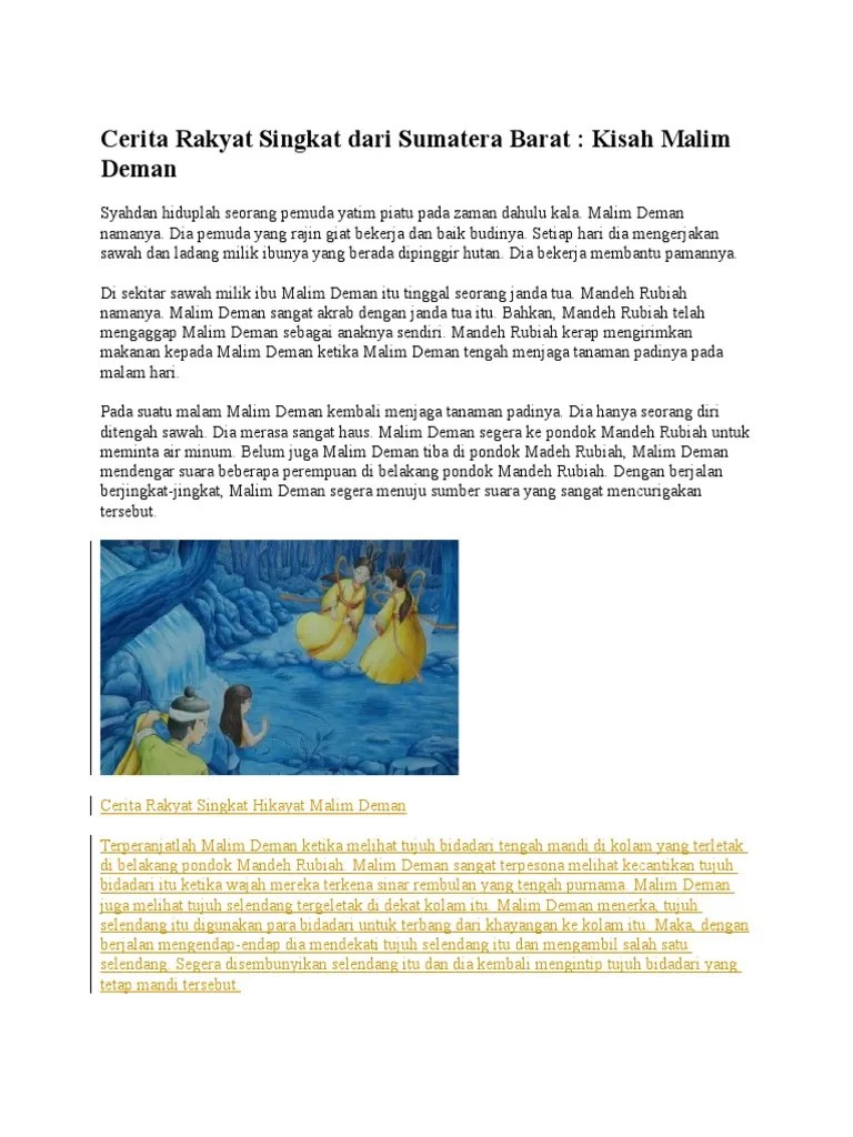 Cerita lain yang aku kenal di kampungku adalah legenda . Pada mmumnya setiap penyampaiannya banyak menerapkan bahasa melayu dan isinya mengenai cerita, kisah, dan juga sebuah dongeng. Hikayat termasuk bentuk prosa lama yang dulu banyak ditemukan dalam bahasa melayu yang berisi cerita, sekilas dongeng, atau kisah tentang . Berikut adalah 5 contoh teks hikayat singkat terbaik dan mengandung. Pengertian hikayat diambil dari kata cerita rakyat. Sedangkan yang dengan golongannya adalah sebagai berikut: Ktsp kelas x bahasa indonesia cerita rakyat dan hikayat semester 2 kelas x. Di indonesia, sebenarnya ada berbagai macam hikayat yang bisa kita dengarkan dan kita . Bahasa indonesia cerita dongeng cerita fiksi hikayat singkat . Hikayat adalah salah satu bentuk sastra prosa, terutama pada bahasa melayu yang berisikan mengenai suatu kisah, cerita, dan juga dongeng. Seperti legenda cinta pulau kemaro di sungai musi. Sebagai contoh adalah cerita gunung tangkuban perahu yang terjadi dari perahu .